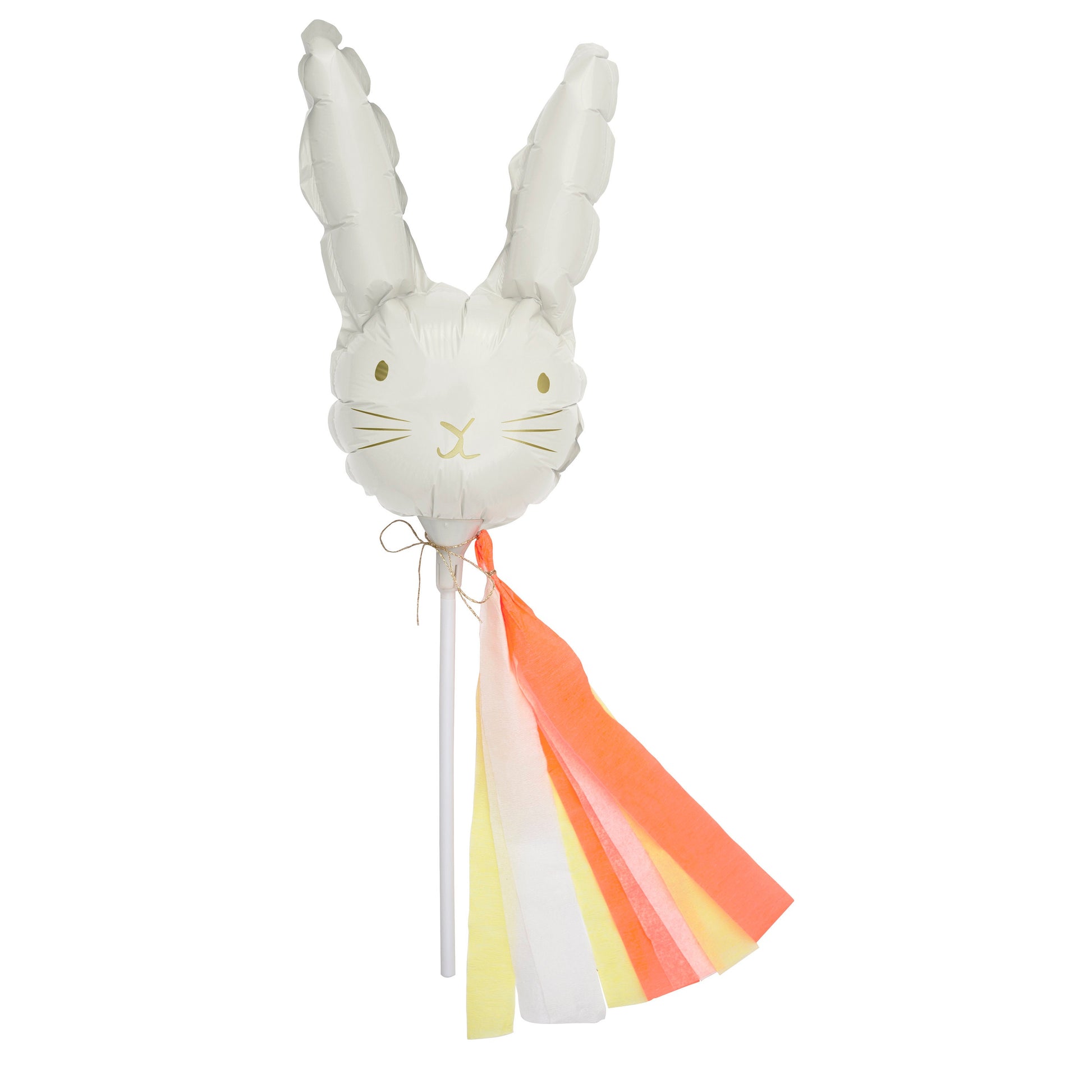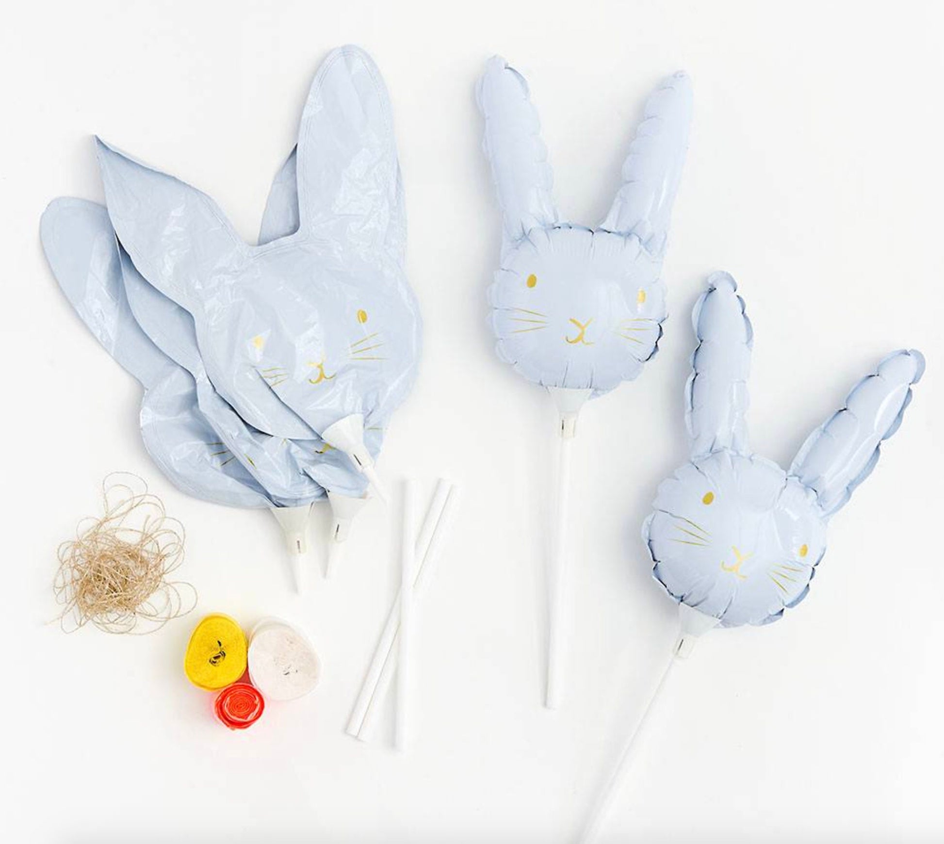 The Easter run-up gets adorable with these mini bunny balloons on sticks that come alive in spectacular fashion with the included crêpe streamers and gold thread. Add your own ribbons or accessories for additional creative fun or if you want to rock a different color scheme. Easy DIY instructions included and no helium required to make them stand tall. These sweet little balloons make adorable favors, basket-fillers, and decor for home, school or office.