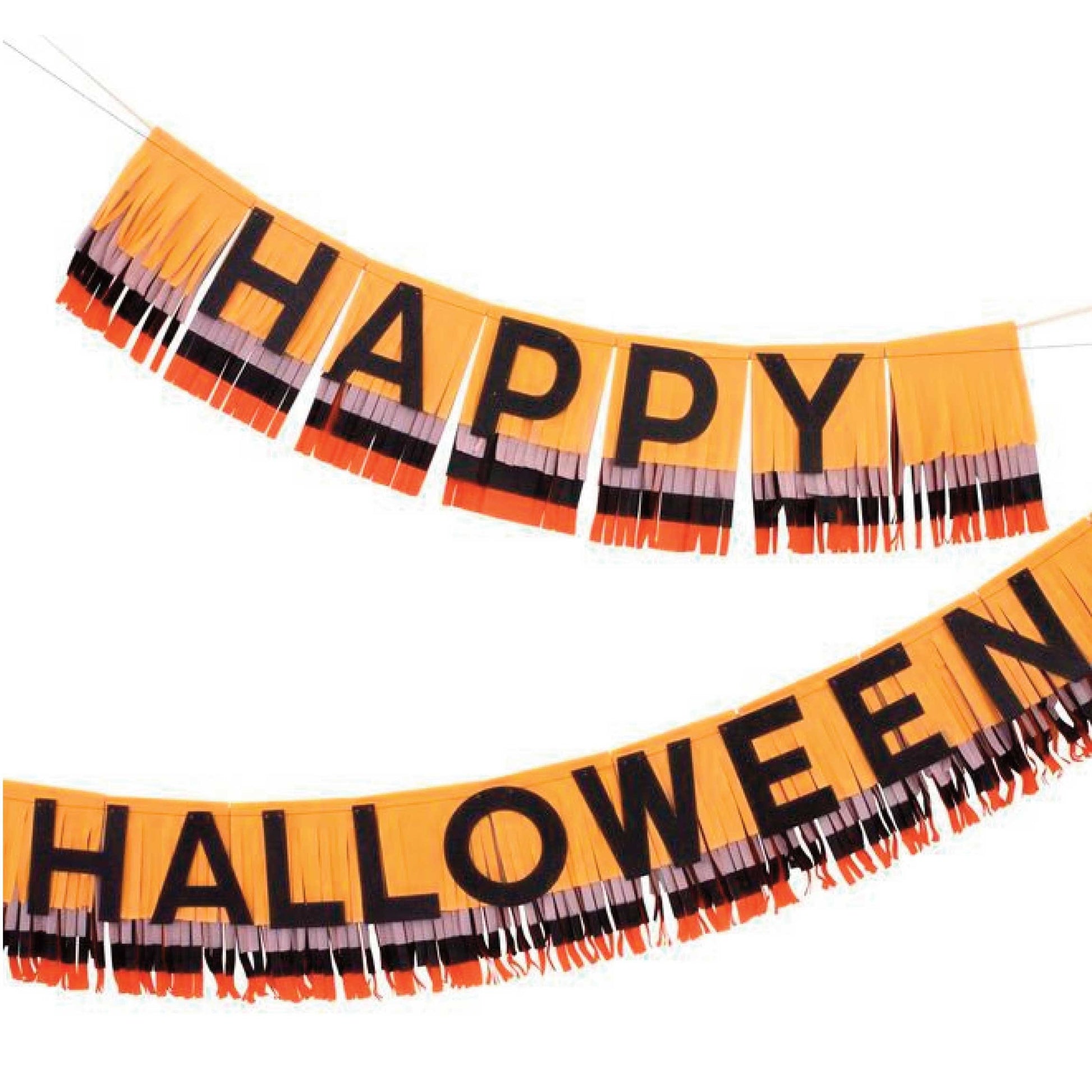 This Happy Halloween garland spreads seasonal wishes with fringed tissue paper, glittered letters, and a color scheme of pale pink, peach, orange, and black. The letters are pre-threaded onto cord, and the fringing is stitched together with satin ribbon at either end. By boutique paper and party designer Meri Meri.
