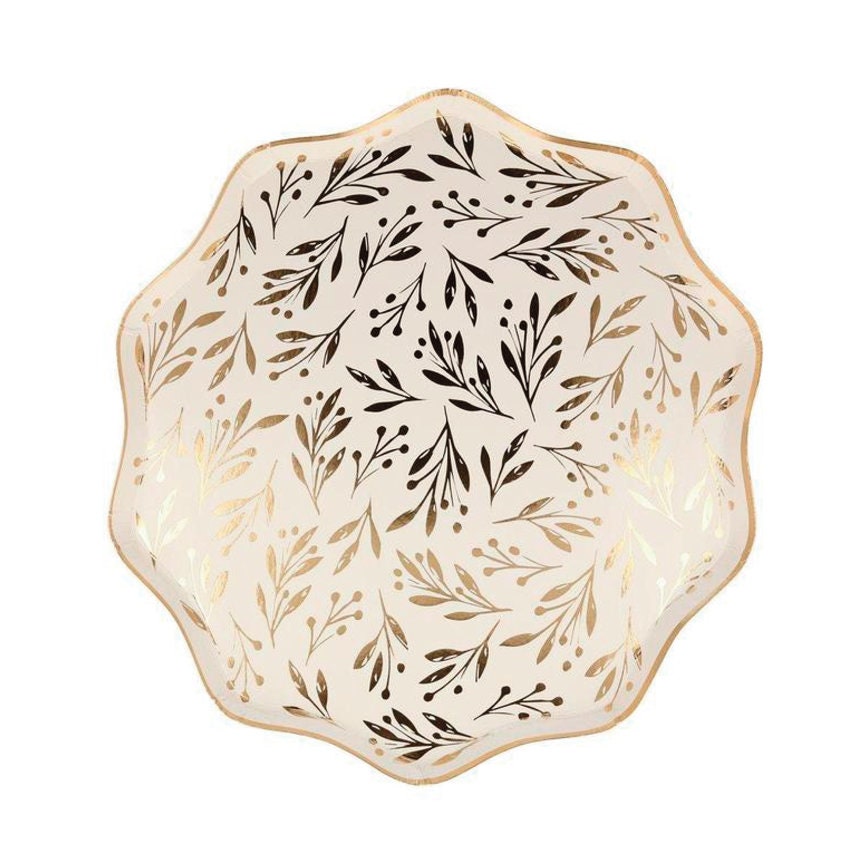 Leaves and berries take on botanical grace when they’re rendered in shiny gold foil in this 10.5-inch paper dinner plate, and the wavy gold border adds extra charm. A sophisticated choice for fall, winter and holiday events (including Thanksgiving, Christmas, and New Year’s), this luxury tableware is a fabulous mix-and-match with other dinnerware patterns, including your fine china treasures.