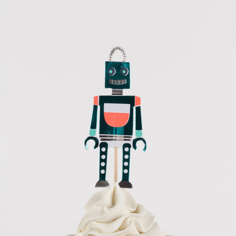 Elevate a robot or space-themed bash with out-of-this-world treats made with Meri Meri’s fabulous robot cupcake kit. Fantastic kid-pleasing designs with shiny foil and cord and braid embellishments will give little scientists a thrill.