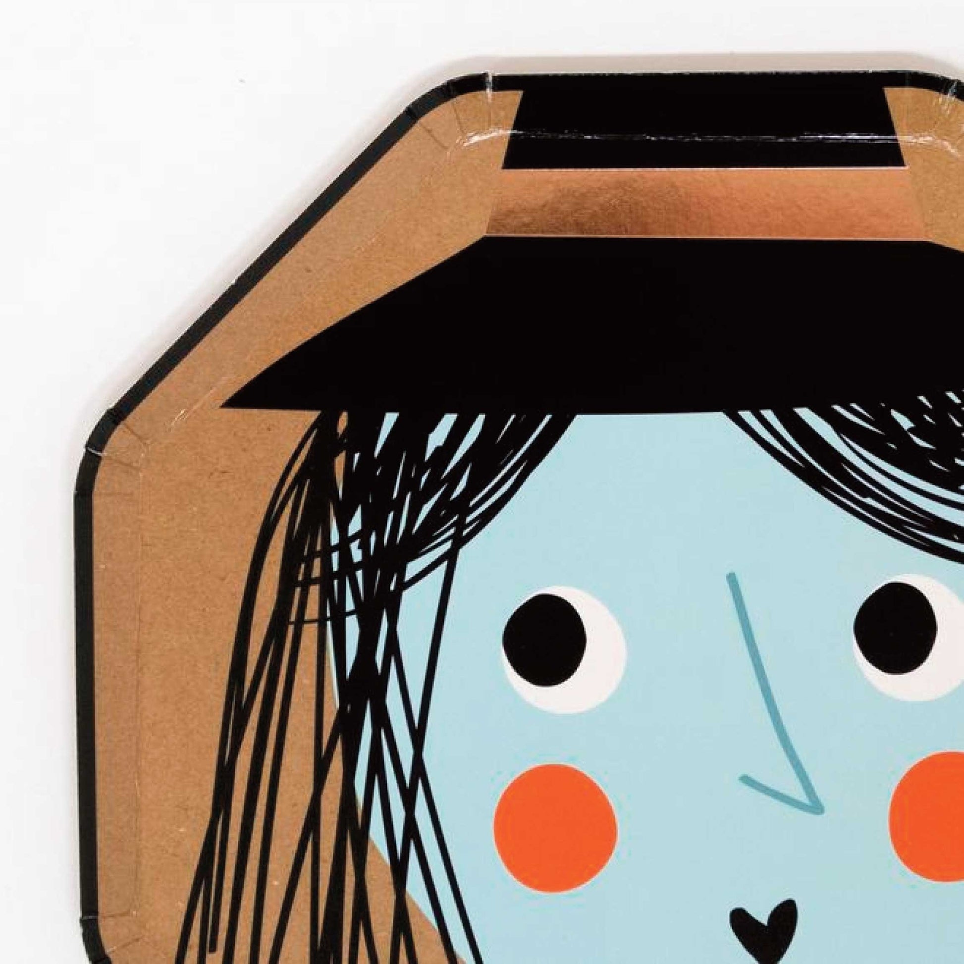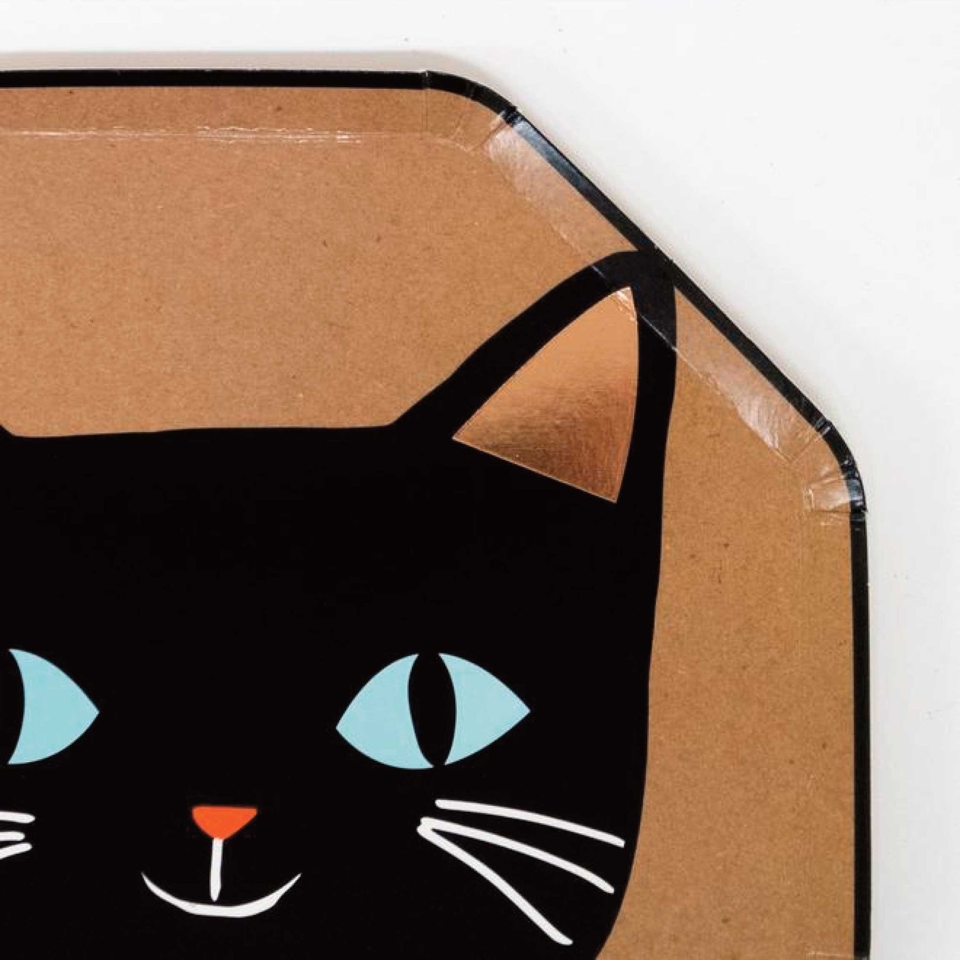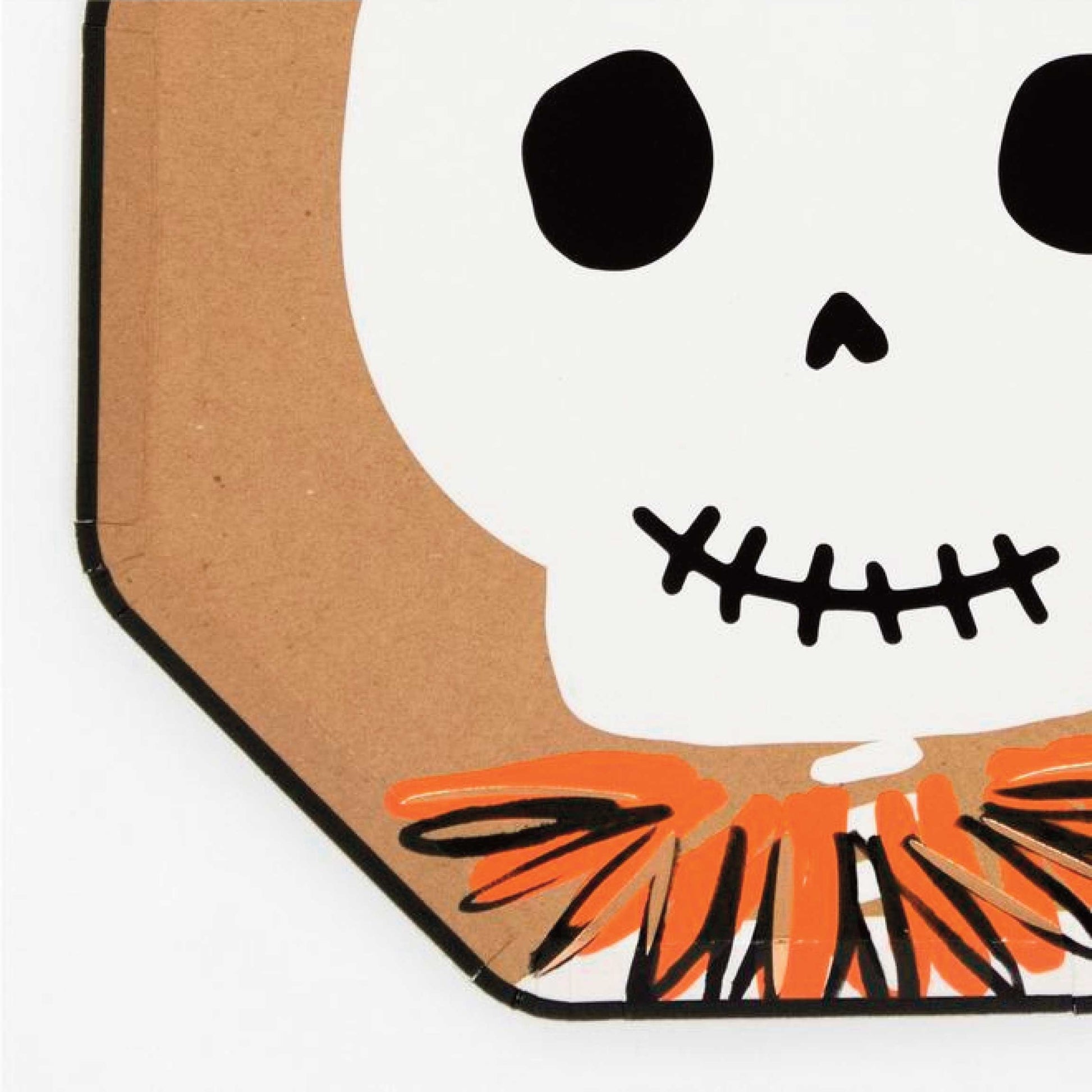 These 8.5-inch paper plates feature vintage-inspired skeletons, witches, black cats and pumpkin heads in moody colors with copper foil accents. Not too small and not too big ... perfect for snacks, dessert or kids’ meals.